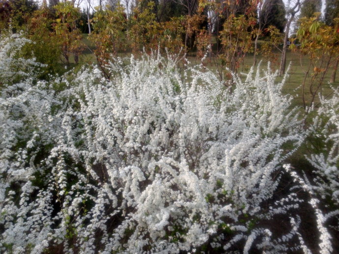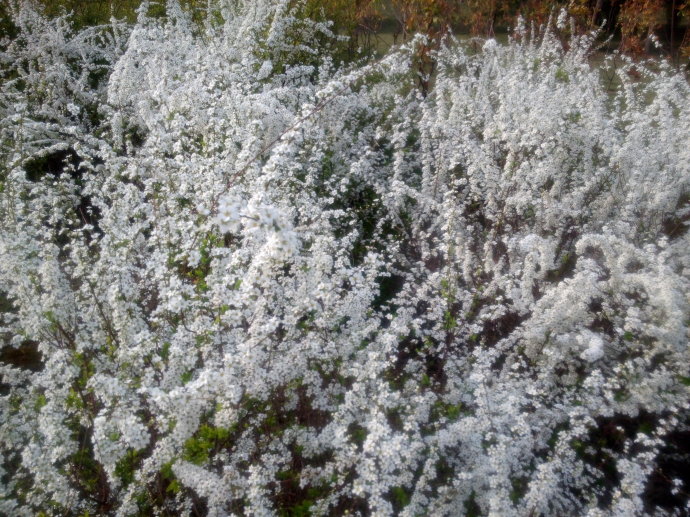 一直喜歡叫它噴雪花,而不是珍珠繡線菊什么的,它是開在萬紫千紅的春天里最熱鬧的時刻,這個時候,第一撥兒的梅花呀、玉蘭呀、杏花呀、紅葉李呀什么的已經開過去了,金鐘呀,連翹呀,還有各種的桃花、梨花、榆葉梅、海棠花……趕著趟地擁擠過來,如T臺上的選美大賽,亂哄哄的,只顧著爭奇斗艷。放眼一望,滿天滿地都是花紅柳綠,姹紫千紅,任憑你趔趄著腿兒使勁地趕著趟,眨巴著眼睛使勁地東張西望也是看不過來了,這個時候,噴雪花開了,如白雪壓枝,一片一片的,開在和煦的春風里,這是陽春里的白雪呀,那份高潔和簡約,是另類的驚艷,唬得鬧嚷嚷的百花全都噤了聲……